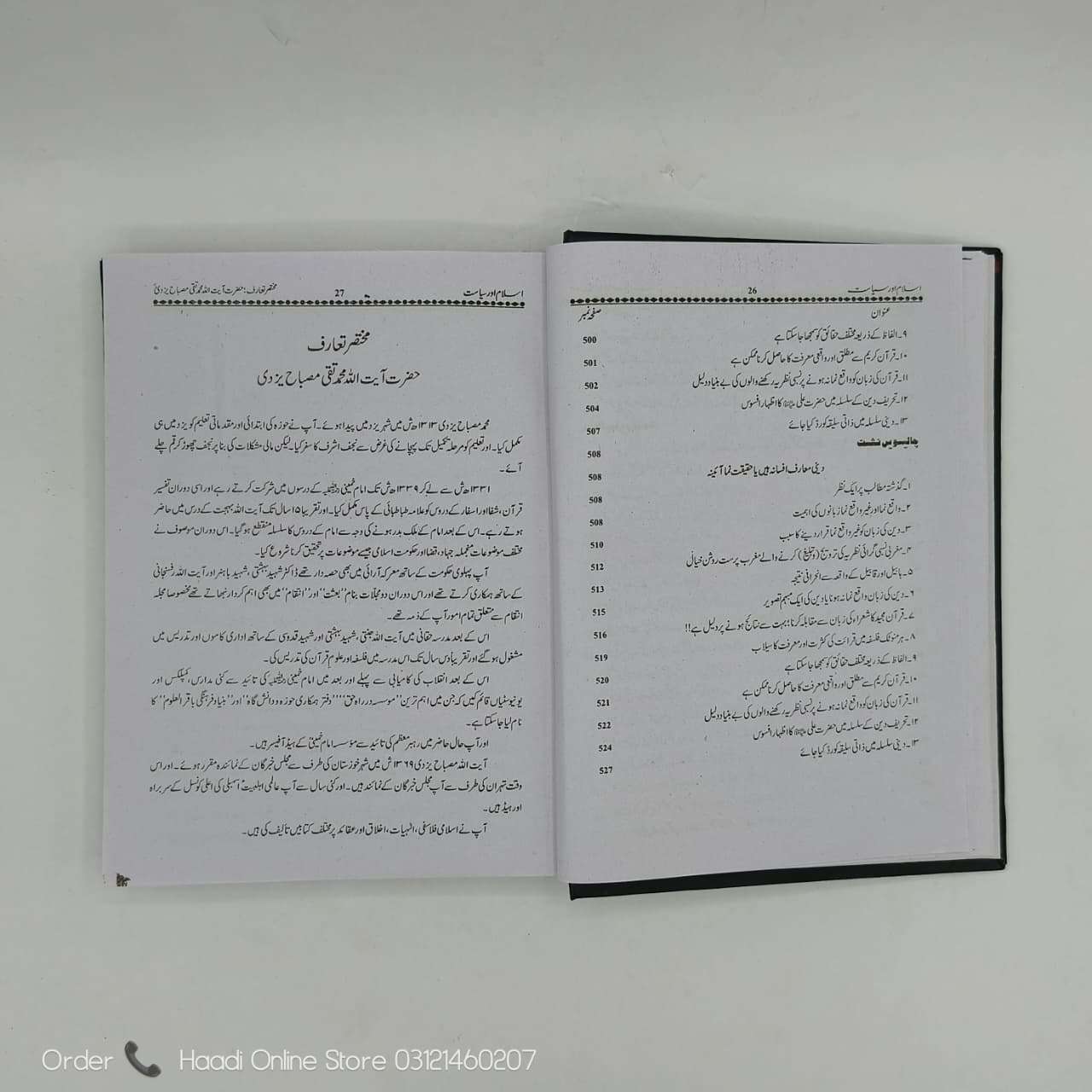 حضرت آیت الله محمد تقی مصباح یزدی ایران کی علمی و سیاسی و سماجی مشہور و معروف شخصیت ہیں یہ کتاب آقائی مصباح یزدی کی چالیس تقاریر کا مجموعہ ہے ان تقاریر میں انہوں نے نہ صرف یہ کہ اسلامی سیاست کے خدو خال کو واضح کیا بلکہ دنیاوی دیور پی سیاست کے مکروہ چہرے سے نقاب نوچ ڈالی ۔ آقائی مصباح یزدی پہلی تقریر سے جو گفتگو شروع کرتے ہیں تو لگتا ہے کہ اب کوئی اور کام نہیں بلکہ اس کتاب کو پورا کر کے اٹھنا ہے کیونکہ کتاب شروع کرنے کے بعد اس کو چھوڑ نا بڑا مشکل نظر آتا ہے۔